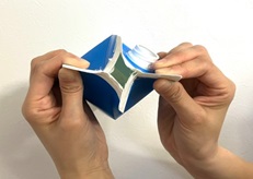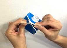 - キャップ付き牛乳パックは、キャップは「プラスチック」、容器本体と注ぎ口は「紙パック」として分別されます。牛乳パックの屋根部分の凹みに親指を入れ、両側の接着部分を広げます。広げた屋根部分の両端を持ち、左右に引っ張り接着部分を開きます。開いた屋根部分から折り目に沿って、容器をハサミで切り開きます。底面は3辺を切り、1辺を残します。※ハサミを使わずに手で開くことも可能です注ぎ口をつけたまま、紙パックとしてリサイクル可能です。各自治体の区分に従って適切に処理してください。